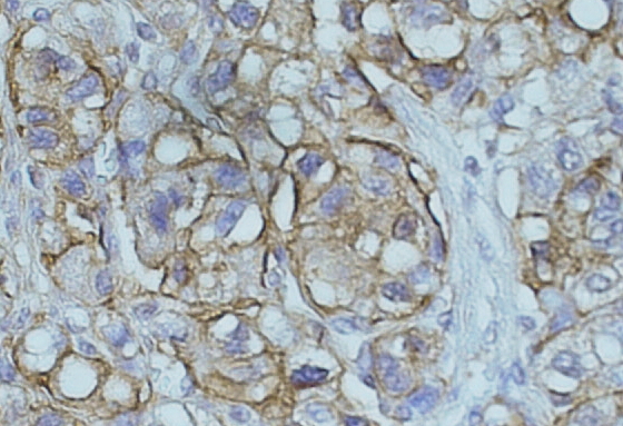 APG00213G (0.5 μg/ml) staining of paraffin embedded Human hepatocelluar carcinoma. Data obtained from C. Furer, Visceral Surgery, University of Bern, Switzerland. |