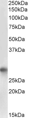 APG00235G (2 μg/ml) staining of Bone marrow lysate (35 μg protein in RIPA buffer). Primary incubation was 1 hour. Detected by chemiluminescence. |