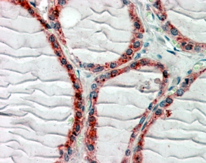APG00277G (2.5 μg/ml) staining of paraffin embedded Human Thyroid Gland. Steamed antigen retrieval with citrate buffer pH 6, AP-staining.