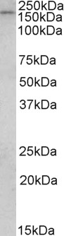 APG00277G (1 μg/ml) staining of Human Breast Cancer lysate (35 μg protein in RIPA buffer). Primary incubation was 1 hour. Detected by chemiluminescence. |