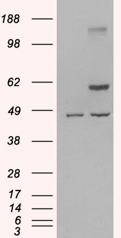 HEK293 overexpressing Human TRAF2 (RC208110) and probed with APG00345G (mock transfection in first lane), tested by Origene.
