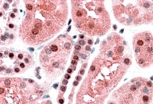 APG00345G (3.8 μg/ml) staining of paraffin embedded Human Kidney. Steamed antigen retrieval with citrate buffer pH 6, AP-staining. |
