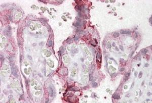 In paraffin embedded Human Placenta shows membrane staining in trophoblasts-. Recommended concentration, 2.5-3.8 μg/ml. |