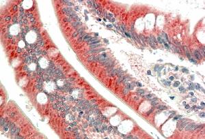 APG00481G (5 μg/ml) staining of paraffin embedded Human Small Intestine. Steamed antigen retrieval with citrate buffer pH 6, AP-staining. |