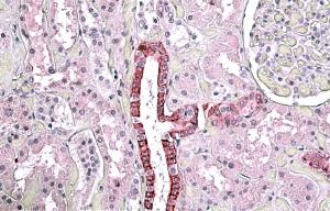 APG00632G (3.8 μg/ml) staining of paraffin embedded Human Kidney. Steamed antigen retrieval with citrate buffer pH 6, AP-staining. |