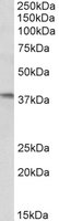 APG00651G (0.3 μg/ml) staining of Daudi lysate (35 μg protein in RIPA buffer). Primary incubation was 1 hour. Detected by chemiluminescence. |