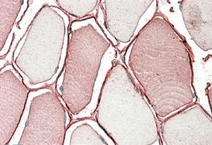 APG00713G (3.8 μg/ml) staining of paraffin embedded Human Skeletal Muscle. Steamed antigen retrieval with citrate buffer pH 6, AP-staining. |