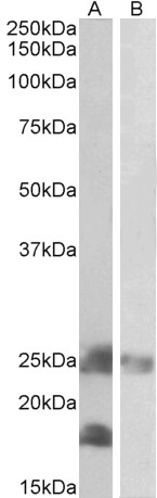 APG00715G (0.2 μg/ml) staining of Mouse (A) and Rat (B) Skeletal Muscle lysates (35 μg protein in RIPA buffer). Primary incubation was 1 hour. Detected by chemiluminescence. |