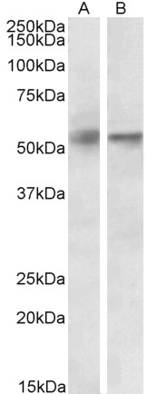 APG00749G (1 μg/ml) staining of Mouse Spleen (A) and Testis (B) lysates (35 μg protein in RIPA buffer). Primary incubation was 1 hour. Detected by chemiluminescence. |