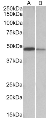 EB10679 (0.1 μg/ml) staining of Mouse Lymph Nodes (A) and Mouse Intestine (B) lysates (35 μg protein in RIPA buffer). Primary incubation was 1 hour. Detected by chemiluminescence. |