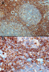 APG00263G (0.3 μg/ml) staining of paraffin embedded Human Tonsil. Microwaved antigen retrieval with Tris/EDTA buffer pH9, HRP-staining. A) Strong staining in the interfollicular area and mantle zone. B) Positive cells in the interfollicular area. |