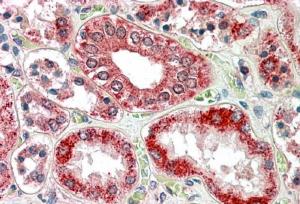 EB6420 (3.8 μg/ml) staining of paraffin embedded Human Kidney. Steamed antigen retrieval with citrate buffer pH 6, AP-staining. |