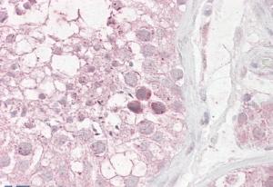 APG00403G (3.8 μg/ml) staining of paraffin embedded Human Testis. Steamed antigen retrieval with citrate buffer pH 6, AP-staining. |