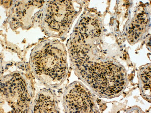 APG00407G (4 μg/ml) staining of paraffin embedded Human Testis. Steamed antigen retrieval with Tris/EDTA buffer pH 9, HRP-staining. These results could not be obtained after antigen retrieval at pH6. |