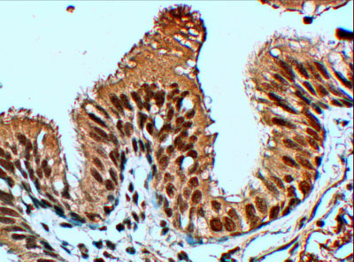 APG00418G (4 μg/ml) staining of paraffin embedded Human Lung. Steamed antigen retrieval with citrate buffer pH 6, HRP-staining. |