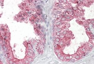 APG00476G (3.8 μg/ml) staining of paraffin embedded Human Prostate. Steamed antigen retrieval with citrate buffer pH 6, AP-staining. |