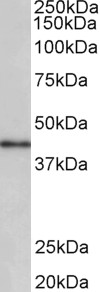 APG00801G (0.3 μg/ml) staining of Human Placenta lysate (35 μg protein in RIPA buffer). Primary incubation was 1 hour. Detected by chemiluminescence. |