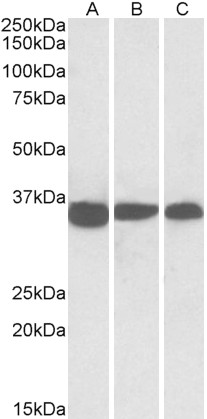 AF3816a (0.03 μg/ml) staining of NIH3T3 (A), Mouse Testis (B) and Rat Testis (C) lysates (35 μg protein in RIPA buffer). Primary incubation was 1 hour. Detected by chemiluminescence. |