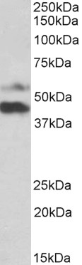 APG00863G (1 μg/ml) staining of Human Colorectal cancer lysate (35 μg protein in RIPA buffer). Primary incubation was 1 hour. Detected by chemiluminescence. |