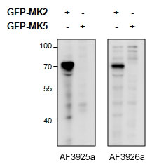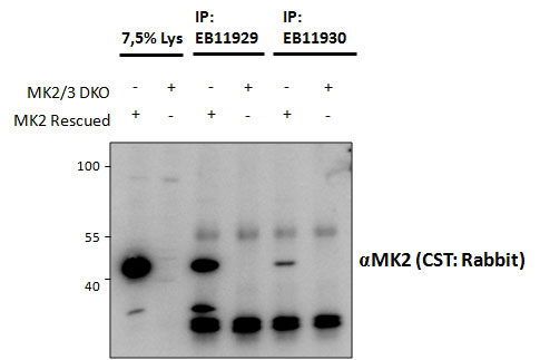 APG00873G and AF3926a (1.5ug) immunoprecipitations from lysates of MK2/MK3 double knockout MEFs, with (third and fifth lanes) and without (fourth and sixth lanes) rescued MK2 expression through retroviral transduction. The corresponding lysates (first and second lane resp.) were analyzed in parallel in this Western blot labelled with rabbit anti-MK2. |