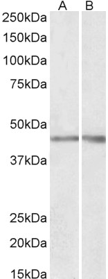 APG00908G (0.3 μg/ml) staining of Human (A) and Mouse (B) Kidney lysates (35 μg protein in RIPA buffer). Primary incubation was 1 hour. Detected by chemiluminescence. |