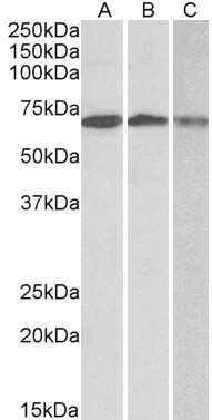 APG00930G (0.3 μg/ml) staining of Daudi (A), Jurkat (B) and K562 (C) lysates (35 μg protein in RIPA buffer). Primary incubation was 1 hour. Detected by chemiluminescence. |
