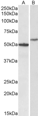 APG00949G (0.3 μg/ml) staining of Human Hippocampus (A) and HeLa (B) lysates (35 μg protein in RIPA buffer). Primary incubation was 1 hour. Detected by chemiluminescence. |