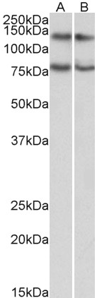 APG00971G (0.3 μg/ml) staining of Jurkat (A) and HeLa (B) lysates (35 μg protein in RIPA buffer). Primary incubation was 1 hour. Detected by chemiluminescence. |