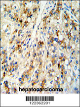 Formalin-fixed and paraffin-embedded human hepatocarcinoma reacted with CECR5 Antibody (Center), which was peroxidase-conjugated to the secondary antibody, followed by DAB staining. This data demonstrates the use of this antibody for immunohistochemistry; clinical relevance has not been evaluated.