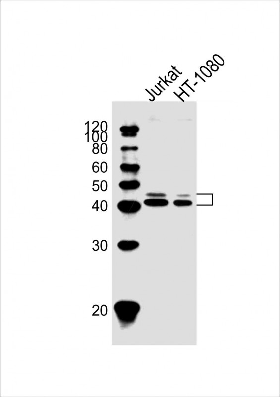All lanes : Anti-CECR5 Antibody (Center) at 1:1000 dilution Lane 1: Jurkat whole cell lysate Lane 2: HT-1080 whole cell lysate Lysates/proteins at 20 μg per lane. Secondary Goat Anti-Rabbit IgG, (H+L), Peroxidase conjugated at 1/10000 dilution. Predicted band size : 46 kDa Blocking/Dilution buffer: 5% NFDM/TBST.