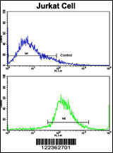 Flow cytometric analysis of jurkat cells using CECR5 Antibody (Center)(bottom histogram) compared to a negative control cell (top histogram). FITC-conjugated goat-anti-rabbit secondary antibodies were used for the analysis. |