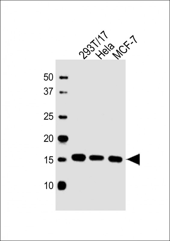 All lanes : Anti-UBE2D3 Antibody (C-term) at 1:1000 dilution Lane 1: 293T/17 whole cell lysate Lane 2: Hela whole cell lysate Lane 3: MCF-7 whole cell lysate Lysates/proteins at 20 μg per lane. Secondary Goat Anti-Rabbit IgG, (H+L), Peroxidase conjugated at 1/10000 dilution. Predicted band size : 17 kDa Blocking/Dilution buffer: 5% NFDM/TBST. |