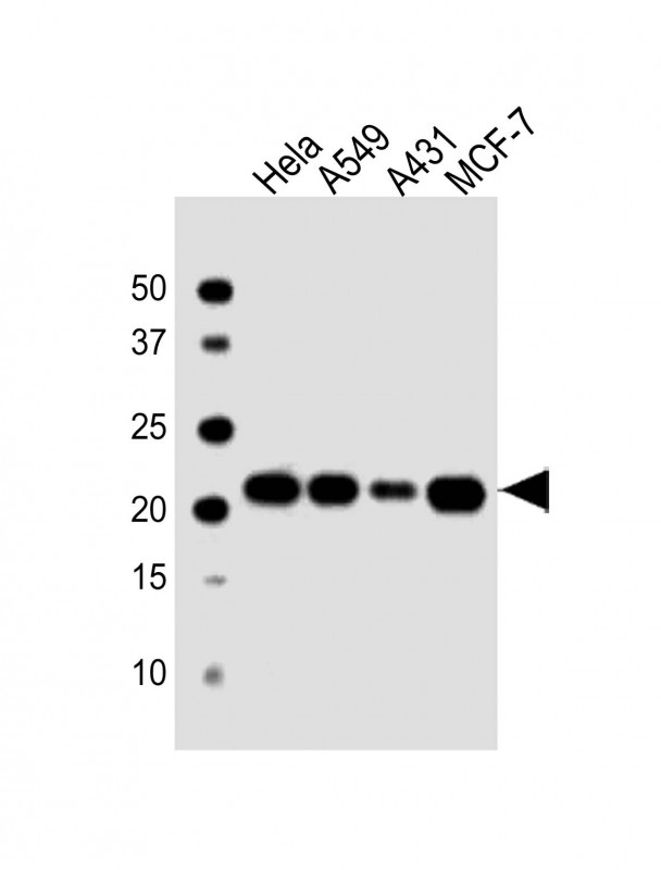 All lanes : Anti-PBP Antibody (0A152) at 1:1000 dilution Lane 1: Hela whole cell lysate Lane 2: A549 whole cell lysate Lane 3: A431 whole cell lysate Lane 4: MCF-7 whole cell lysate Lysates/proteins at 20 μg per lane. Secondary Goat Anti-Rabbit IgG, (H+L), Peroxidase conjugated at 1/10000 dilution. Predicted band size : 21 kDa Blocking/Dilution buffer: 5% NFDM/TBST. |
