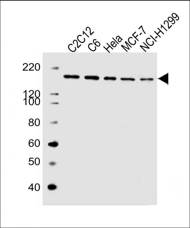 All lanes : Anti-ROCK2 Antibody (C-term) at 1:2000 dilution Lane 1: C2C12 whole cell lysate Lane 2: C6 whole cell lysate Lane 3: Hela whole cell lysate Lane 4: MCF-7 whole cell lysate Lane 5: NCI-H1299 whole cell lysate Lysates/proteins at 20 μg per lane. Secondary Goat Anti-Rabbit IgG, (H+L), Peroxidase conjugated at 1/10000 dilution. Predicted band size : 161 kDa Blocking/Dilution buffer: 5% NFDM/TBST. |