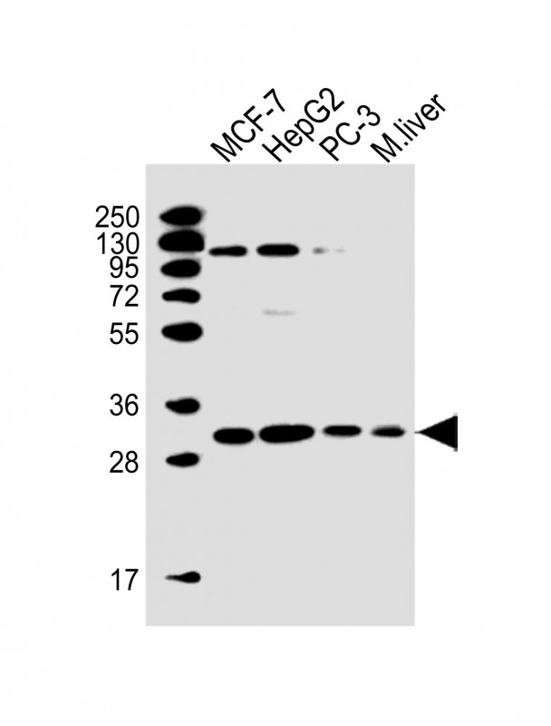 All lanes : Anti-PSME2 Antibody (C-term) at 1:1000 dilution Lane 1: MCF-7 whole cell lysate Lane 2: HepG2 whole cell lysate Lane 3: PC-3 whole cell lysate Lane 4: mouse liver lysate Lysates/proteins at 20 μg per lane. Secondary Goat Anti-Rabbit IgG, (H+L), Peroxidase conjugated at 1/10000 dilution. Predicted band size : 27 kDa Blocking/Dilution buffer: 5% NFDM/TBST.