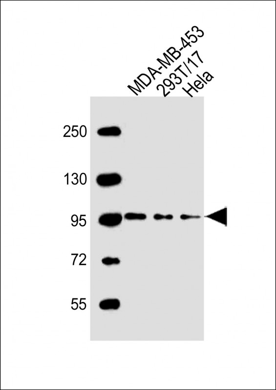 All lanes : Anti-FBXO11 Antibody (N-term) at 1:1000 dilution Lane 1: MDA-MB-453 whole cell lysate Lane 2: 293T/17 whole cell lysate Lane 3: Hela whole cell lysate Lysates/proteins at 20 μg per lane. Secondary Goat Anti-Rabbit IgG, (H+L), Peroxidase conjugated at 1/10000 dilution. Predicted band size : 104 kDa Blocking/Dilution buffer: 5% NFDM/TBST. |