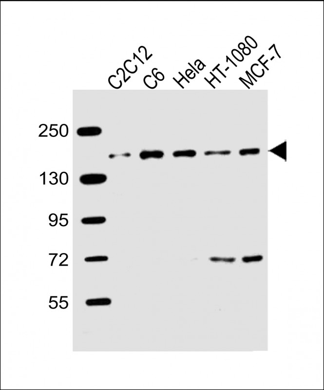 All lanes : Anti-ROCK2 Antibody (C-term) at 1:2000 dilution Lane 1: C2C12 whole cell lysate Lane 2: C6 whole cell lysate Lane 3: Hela whole cell lysate Lane 4: HT-1080 whole cell lysate Lane 5: MCF-7 whole cell lysate Lysates/proteins at 20 μg per lane. Secondary Goat Anti-Rabbit IgG, (H+L), Peroxidase conjugated at 1/10000 dilution. Predicted band size : 161 kDa Blocking/Dilution buffer: 5% NFDM/TBST. |