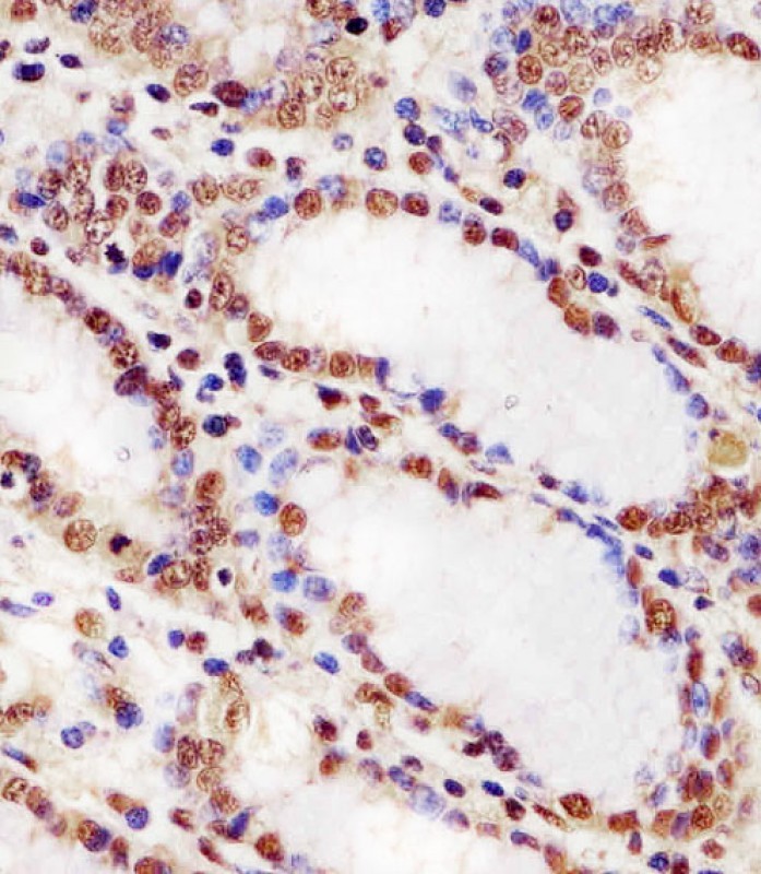 APR06956G staining HNRNPUL2 in human stomach tissue sections by Immunohistochemistry (IHC-P - paraformaldehyde-fixed, paraffin-embedded sections). Tissue was fixed with formaldehyde and blocked with 3% BSA for 0. 5 hour at room temperature; antigen retrieval was by heat mediation with a citrate buffer (pH6). Samples were incubated with primary antibody (1/25) for 1 hours at 37°C. A undiluted biotinylated goat polyvalent antibody was used as the secondary antibody.