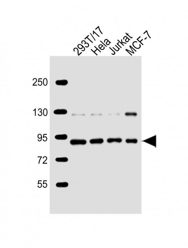 All lanes : Anti-HNRNPUL2 Antibody (Center) at 1:2000 dilution Lane 1: 293T/17 whole cell lysate Lane 2: Hela whole cell lysate Lane 3: Jurkat whole cell lysate Lane 4: MCF-7 whole cell lysate Lysates/proteins at 20 μg per lane. Secondary Goat Anti-Rabbit IgG, (H+L), Peroxidase conjugated at 1/10000 dilution. Predicted band size : 85 kDa Blocking/Dilution buffer: 5% NFDM/TBST. |
