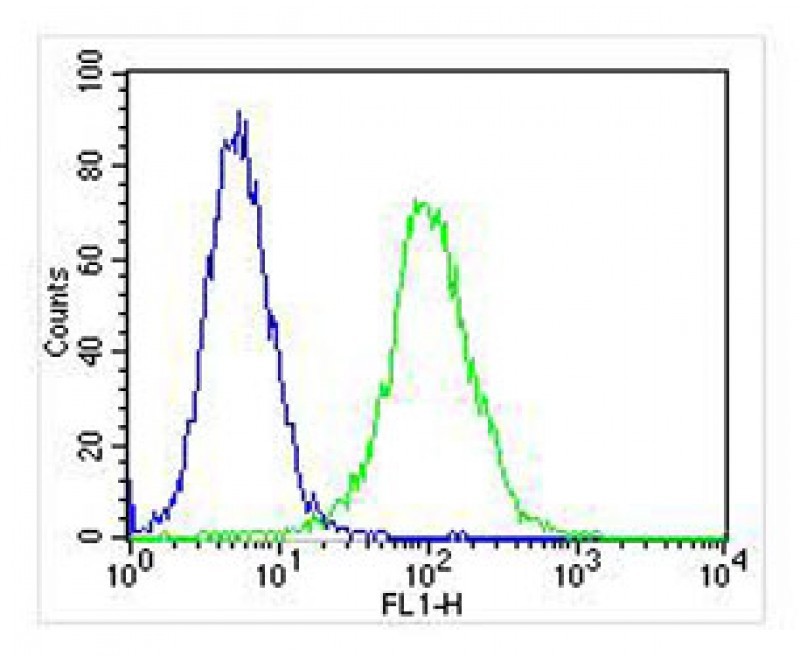 Overlay histogram showing Jurkat cells stained with AMM04346G (green line). The cells were fixed with 2% paraformaldehyde (10 min) and then permeabilized with 90% methanol for 10 min. The cells were then icubated in 2% bovine serum albumin to block non-specific protein-protein interactions followed by the antibody (AMM04346G, 1:25 dilution) for 60 min at 37?C. The secondary antibody used was Goat-Anti-Mouse IgG, DyLight? 488 Conjugated Highly Cross-Adsorbed(NA168821)) at 1/400 dilution for 40 min at 37?C. Isotype control antibody (blue line) was mouse IgG1 (1μg/1x10^6 cells) used under the same conditions. Acquisition of >10, 000 events was performed. |