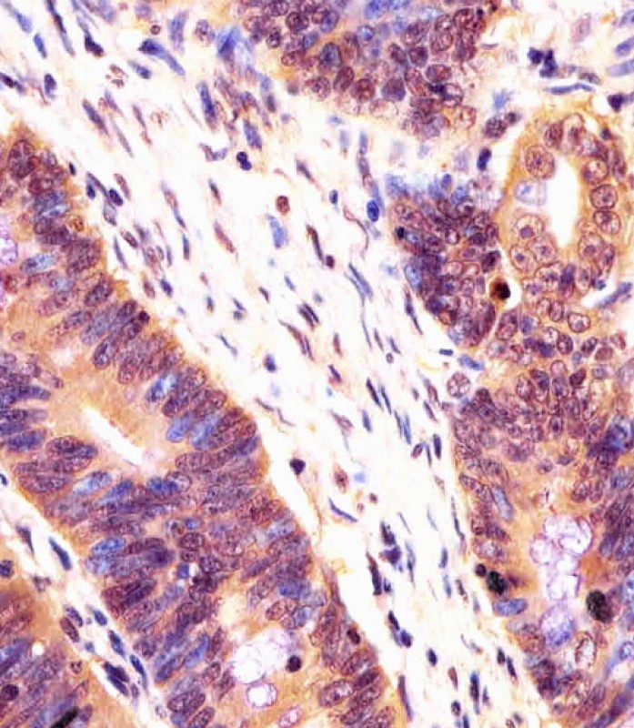 APR06959G staining PSMB7 in human colorectal carcinoma tissue sections by Immunohistochemistry (IHC-P - paraformaldehyde-fixed, paraffin-embedded sections). Tissue was fixed with formaldehyde and blocked with 3% BSA for 0. 5 hour at room temperature; antigen retrieval was by heat mediation with a citrate buffer (pH6). Samples were incubated with primary antibody (1/25) for 1 hours at 37°C. A undiluted biotinylated goat polyvalent antibody was used as the secondary antibody.