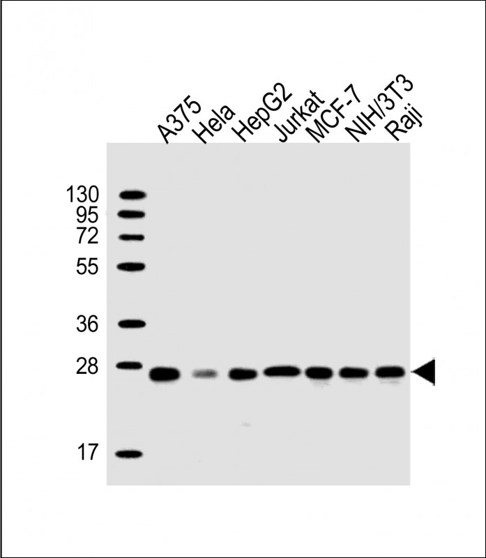 All lanes : Anti-PSMB7 Antibody (Center) at 1:8000 dilution Lane 1: A375 whole cell lysate Lane 2: Hela whole cell lysate Lane 3: HepG2 whole cell lysate Lane 4: Jurkat whole cell lysate Lane 5: MCF-7 whole cell lysate Lane 6: NIH/3T3 whole cell lysate Lane 7: Raji whole cell lysate Lysates/proteins at 20 μg per lane. Secondary Goat Anti-Rabbit IgG, (H+L), Peroxidase conjugated at 1/10000 dilution. Predicted band size : 30 kDa Blocking/Dilution buffer: 5% NFDM/TBST. |