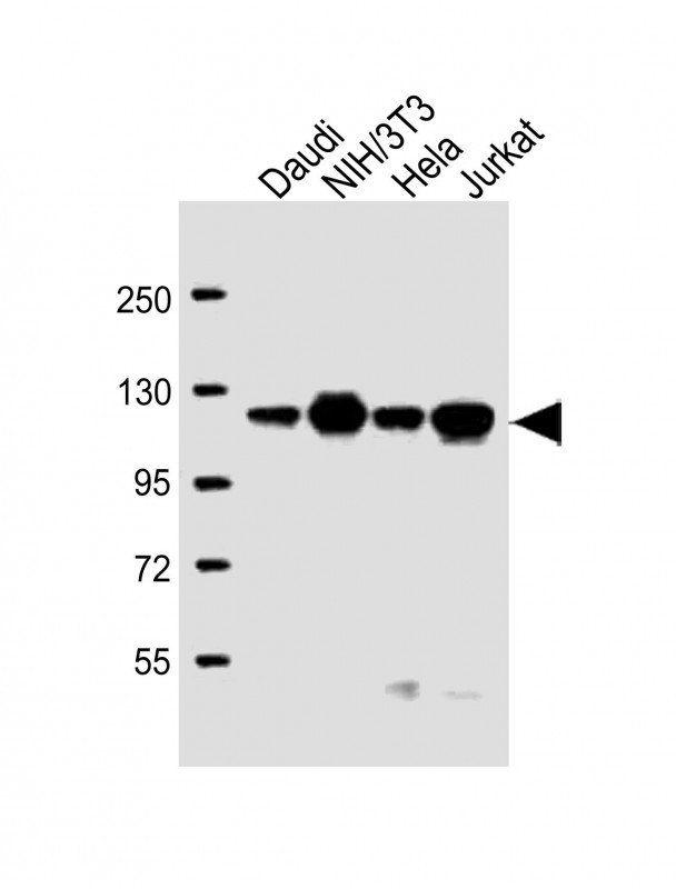 All lanes : Anti-UBA6 Antibody (C-term) at 1:2000 dilution Lane 1: Daudi whole cell lysate Lane 2: NIH/3T3 whole cell lysate Lane 3: Hela whole cell lysate Lane 4: Jurkat whole cell lysate Lysates/proteins at 20 μg per lane. Secondary Goat Anti-Rabbit IgG, (H+L), Peroxidase conjugated at 1/10000 dilution. Predicted band size : 118 kDa Blocking/Dilution buffer: 5% NFDM/TBST. |