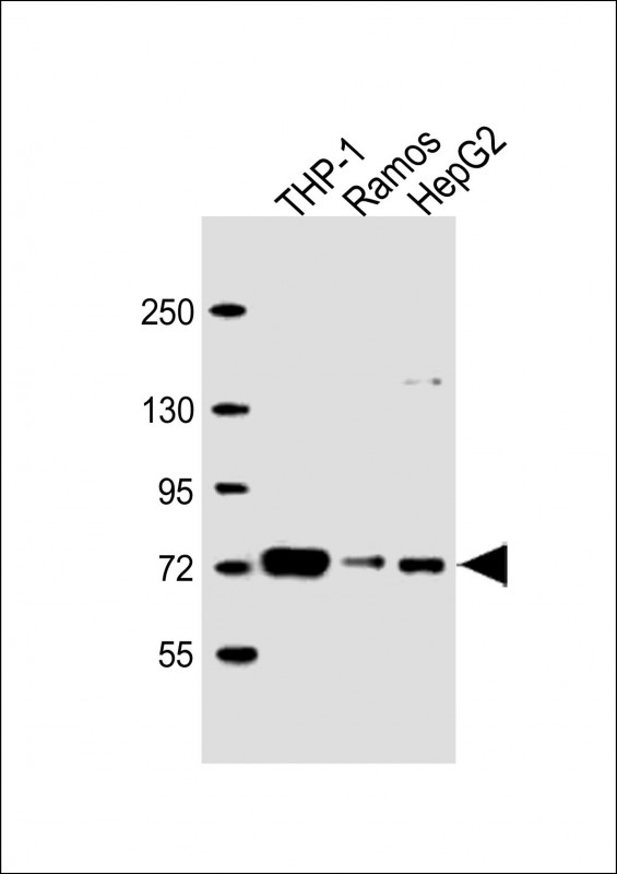 All lanes : Anti-SAMHD1 Antibody (Center) at 1:2000 dilution Lane 1: THP-1 whole cell lysate Lane 2: Ramos whole cell lysate Lane 3: HepG2 whole cell lysate Lysates/proteins at 20 μg per lane. Secondary Goat Anti-Rabbit IgG, (H+L), Peroxidase conjugated at 1/10000 dilution. Predicted band size : 72 kDa Blocking/Dilution buffer: 5% NFDM/TBST. |