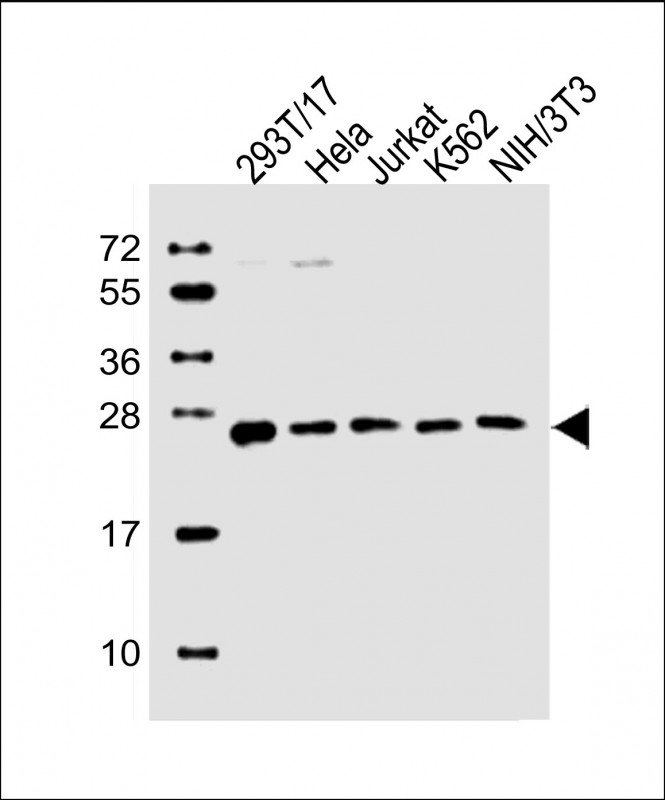 All lanes : Anti-PSMB3 Antibody (Center) at 1:2000 dilution Lane 1: 293T/17 whole cell lysate Lane 2: Hela whole cell lysate Lane 3: Jurkat whole cell lysate Lane 4: K562 whole cell lysate Lane 5: NIH/3T3 whole cell lysate Lysates/proteins at 20 μg per lane. Secondary Goat Anti-Rabbit IgG, (H+L), Peroxidase conjugated at 1/10000 dilution. Predicted band size : 23 kDa Blocking/Dilution buffer: 5% NFDM/TBST. |