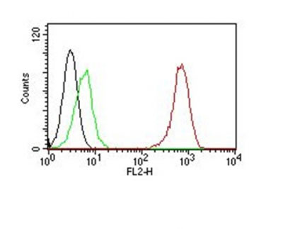 Flow Cytometry of human CD31 on Jurkat Cells. Black: Cells alone; Green: Isotype Control; Red: PE-labeled CD31 Monoclonal Antibody (SPM122). |