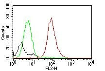Flow Cytometry of mouse CD63 on NIH/3T3 Cells. Black: Cells alone; Green: Isotype Control; Red: PE-labeled CD63 Monoclonal Antibody (MX-49.129.5).