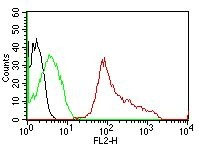 Flow Cytometry of CD63 on human PBMC Cells. Black: Cells alone; Green: Isotype Control; Red: PE-labeled CD63 Monoclonal Antibody (MX-49.129.5). |