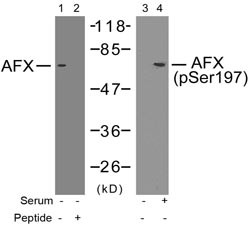 Western blot analysis of extracts from 293 cells using AFX Antibody (S197) (APR00461G, Lane 1 and 2) and Phospho-AFX-S197 Antibody (Lane 3 and 4).