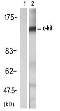 Western blot analysis of extract from A431 cell treated with EGF(200ng/ml, 30min), using C-Kit Antibody (Y721) (APR00467G, Lane 1 and 2). |